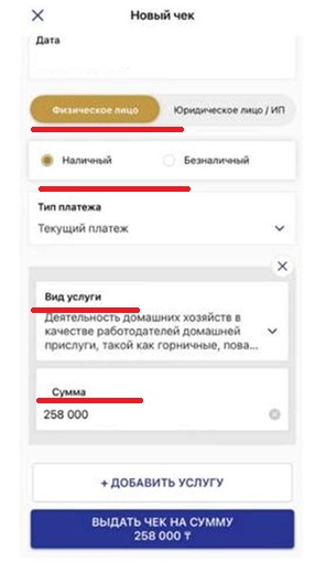 4. Заполнить обязательные поля (тип платежа, вид услуги, сумма) и нажать «Выдать чек на сумму».