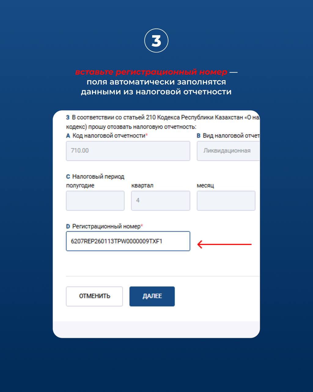 3. Вставьте регистрационный номер – поля автоматически заполнятся данными из налоговой отчётности.