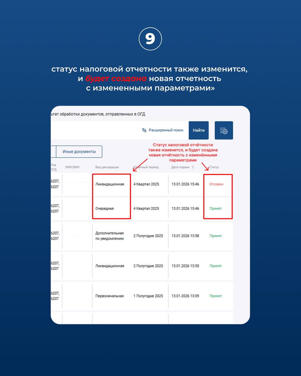 9. Статус налоговой отчетности также изменится, и будет создана новая отчетность с измененными параметрами.