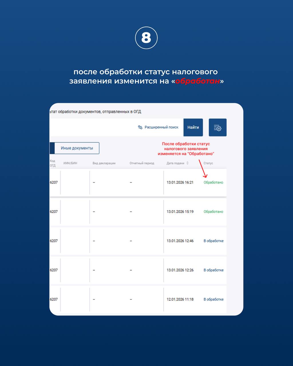 8. После обработки статус налогового заявления изменится на «обработан».