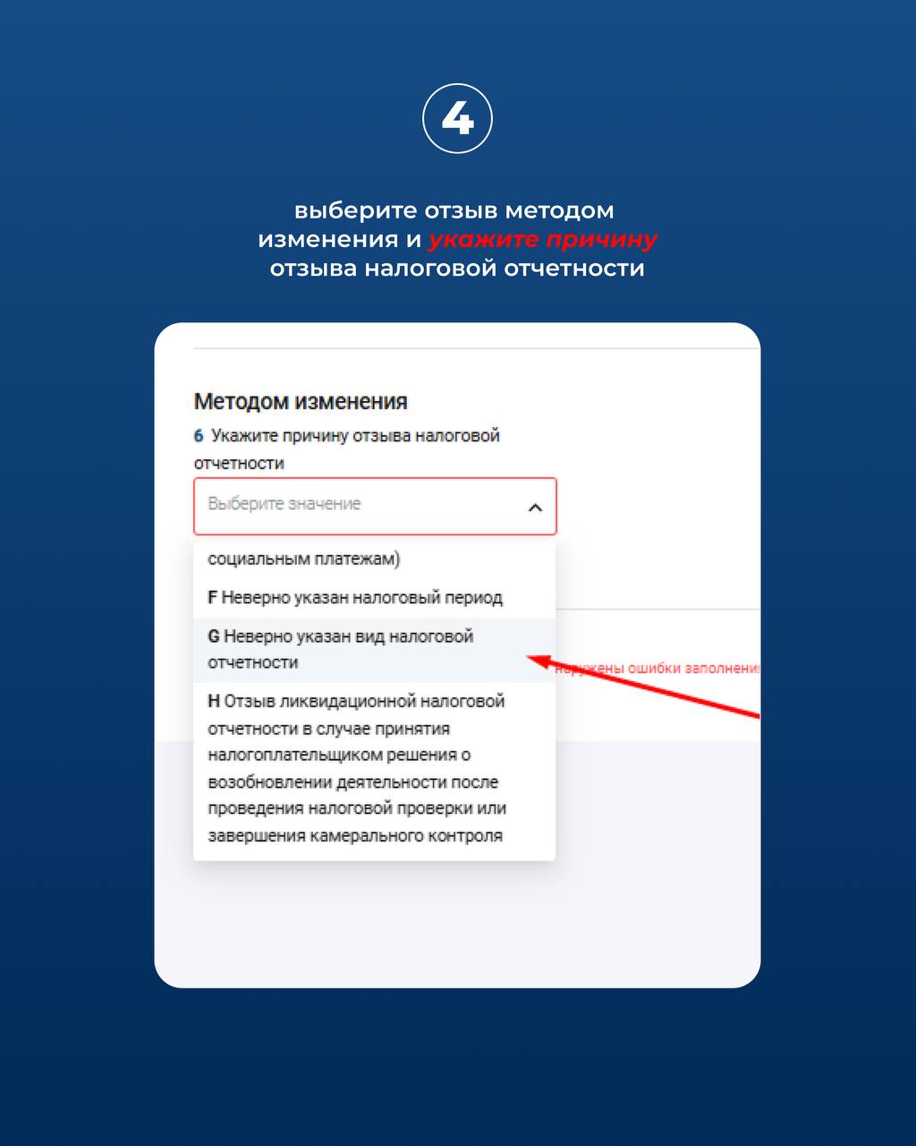 4. Выберите отзыв методом изменения и укажите причину отзыва налоговой отчётности.