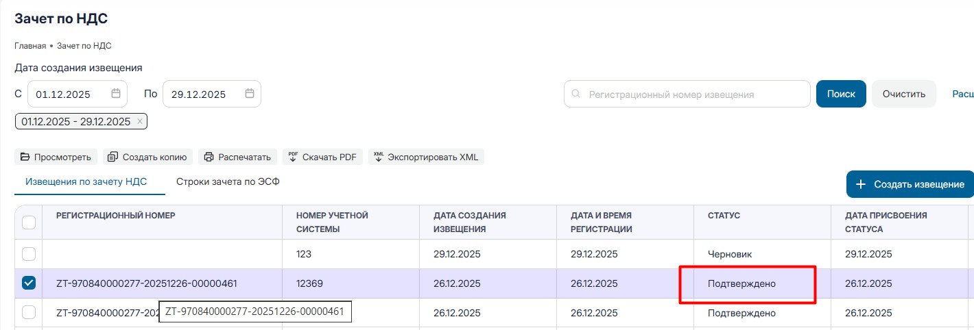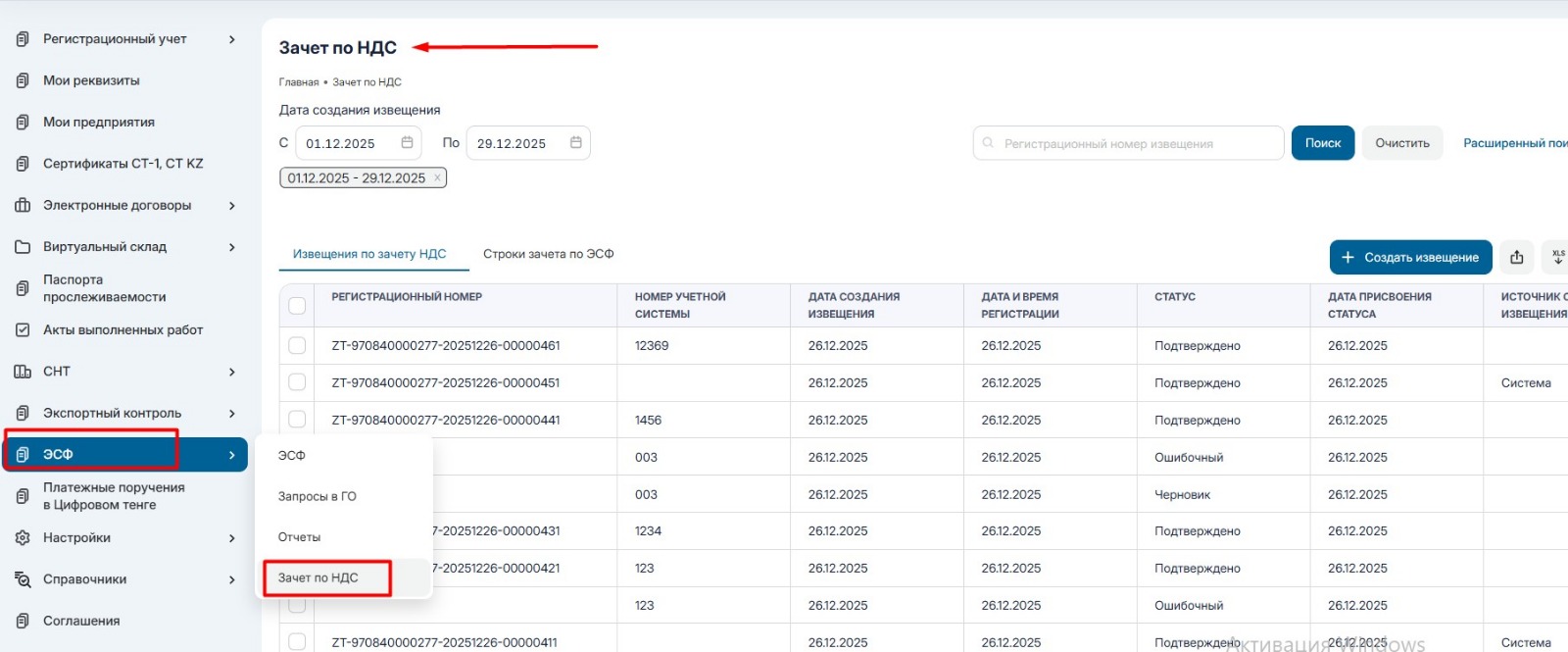 1) Извещения по зачету НДС – отображаются все извещения об отнесении сумм НДС в зачет, сформированные пользователем на веб-портале ИС ЭСФ, импортированные из файлов либо полученные через интеграцию с учетными системами. В данном журнале отображаются извещения во всех статусах, включая: