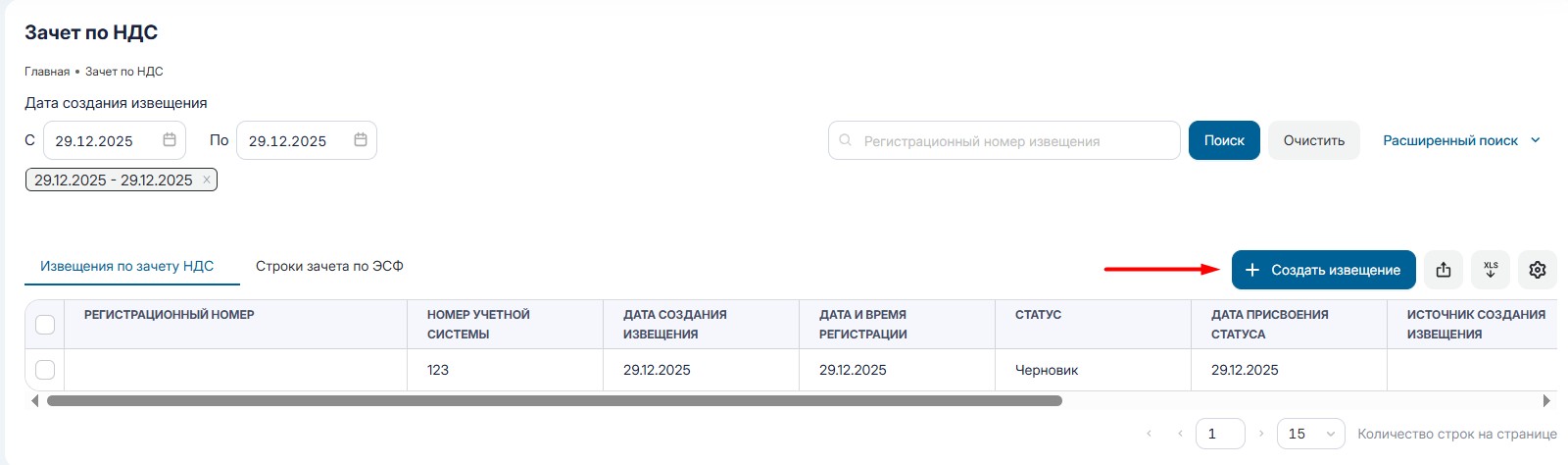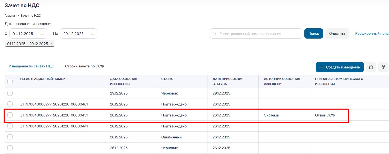 В обоих случаях в системе открывается форма создания извещения об отнесении в зачет НДС.