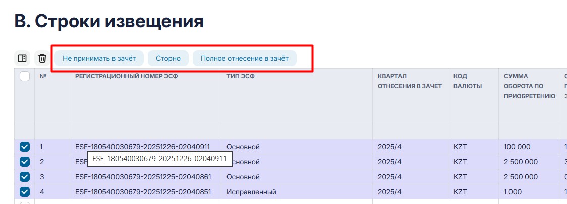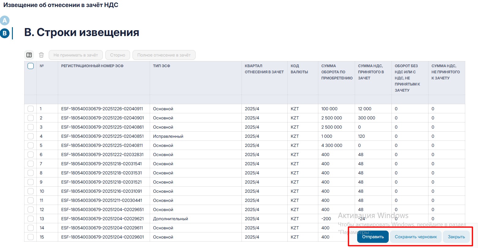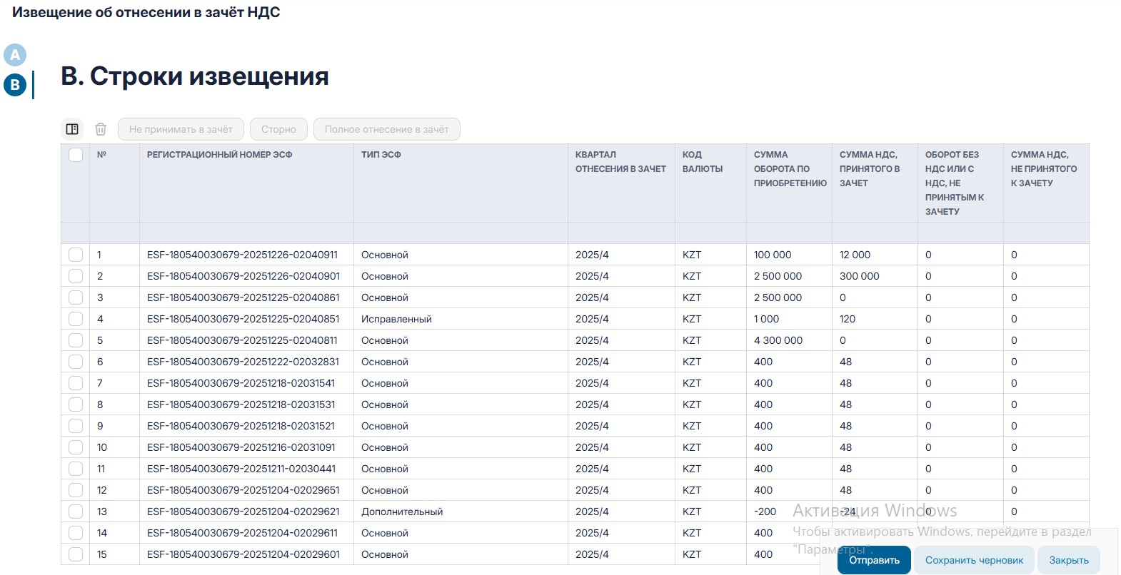 - Полное отнесение в зачет - вся сумма оборота и НДС по ЭСФ принимается к зачету;