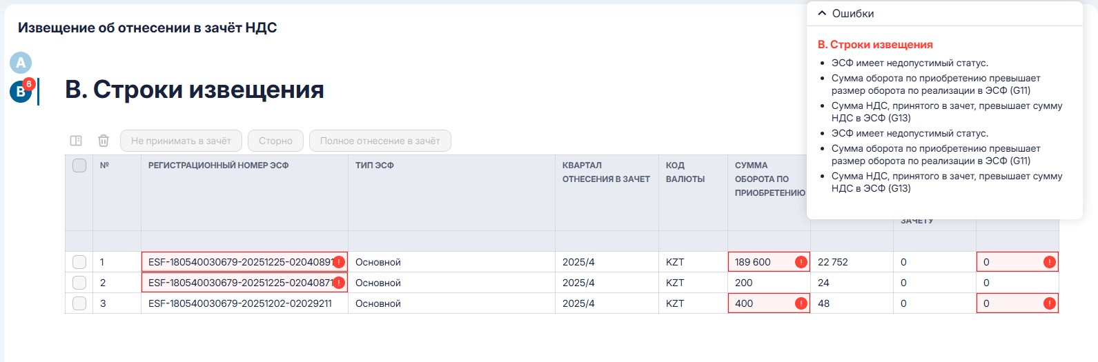 2. из вкладки «Извещения по зачету НДС» путем нажатия кнопки «Создать извещения» и добавления ЭСФ в раздел «B. Строки извещения»