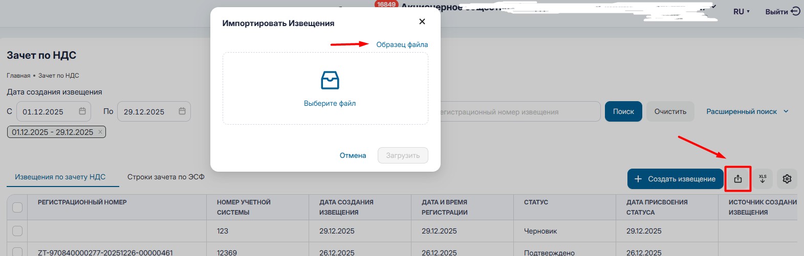Функционал импорта извещений об отнесении НДС в зачет предназначен для загрузки извещений в ИС ЭСФ из файлов формата Excel и XML и может использоваться в случаях, когда формирование извещений выполняется вне веб-портала ИС ЭСФ.