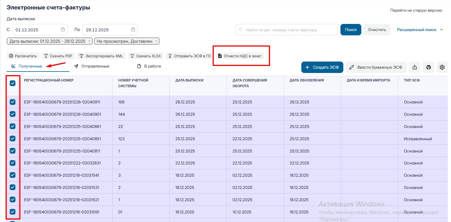 1. из журнала полученных электронных счетов-фактур путем выбора одного или нескольких ЭСФ и выполнения действия «Отнести в зачет НДС».
