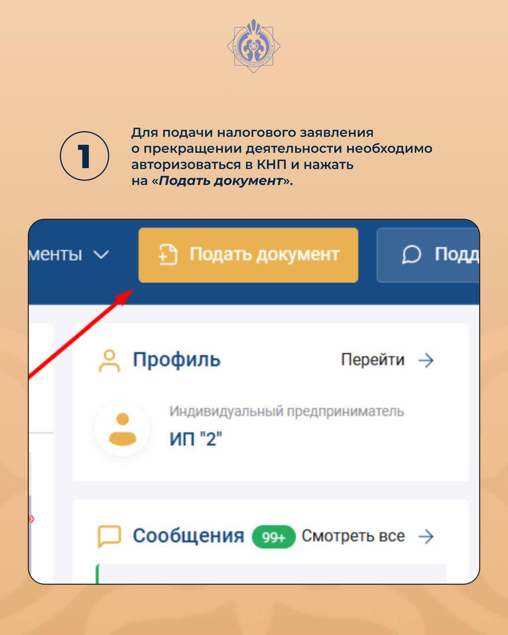 1.Для подачи налогового заявления о прекращении деятельности необходимо авторизоваться в КНП и нажать на «Подать документ».
