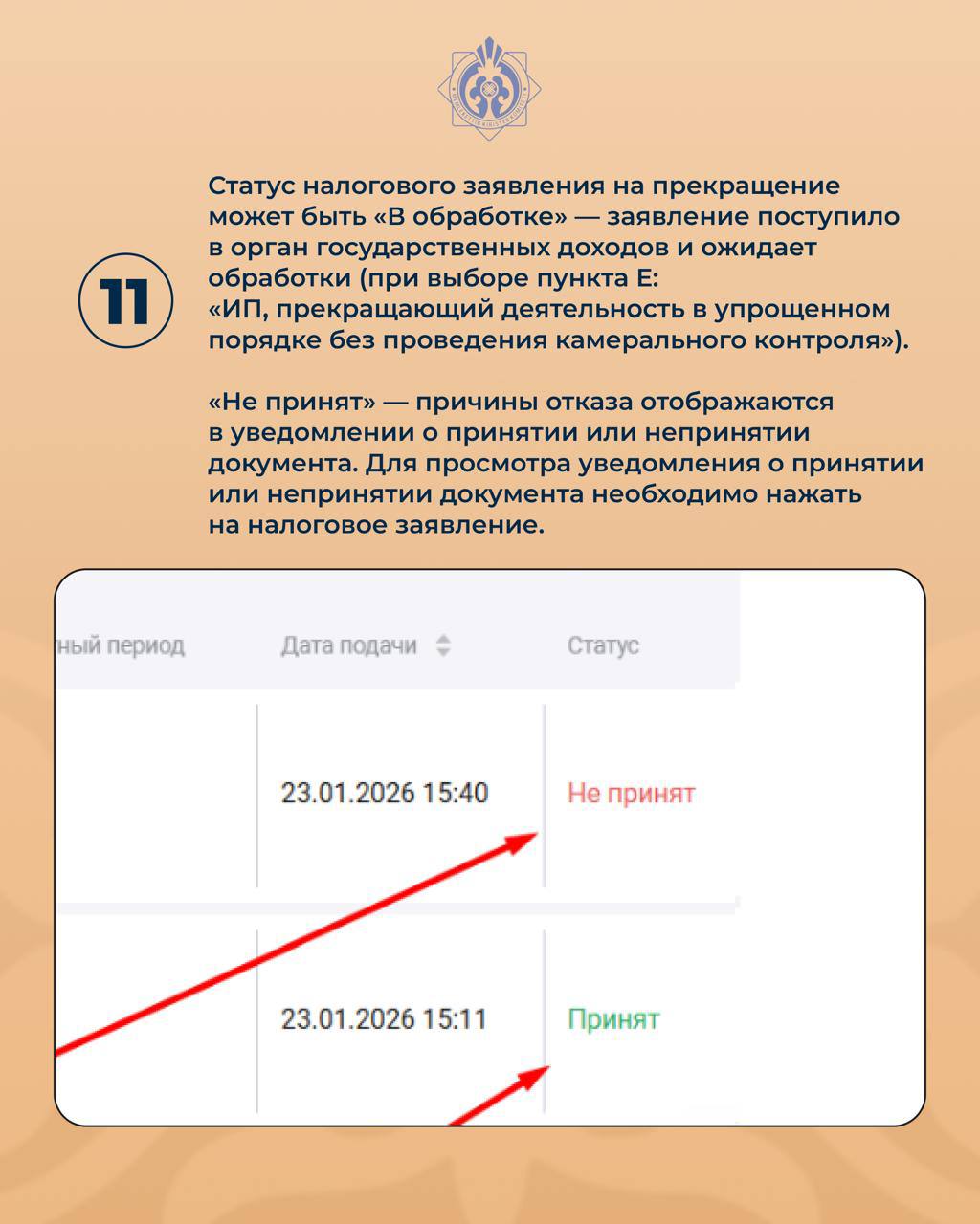 11. Статус налогового заявления на прекращение может быть «В обработке» — заявление поступило в орган государственных доходов и ожидает обработки (при выборе пункта Е: «ИП, прекращающий деятельность в упрощенном порядке без проведения камерального контроля»). «Не принят» — причины отказа отображаются в уведомлении о принятии или непринятии документа. Для просмотра уведомления о принятии или непринятии документа необходимо нажать на налоговое заявление.