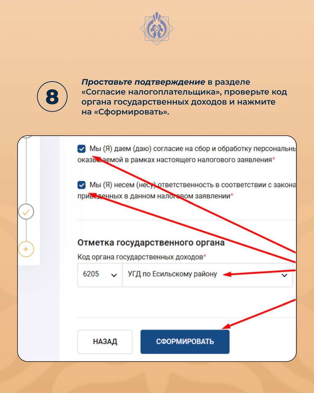 8. Проставьте подтверждение в разделе «Согласие налогоплательщика», проверьте код органа государственных доходов и нажмите на «Сформировать».