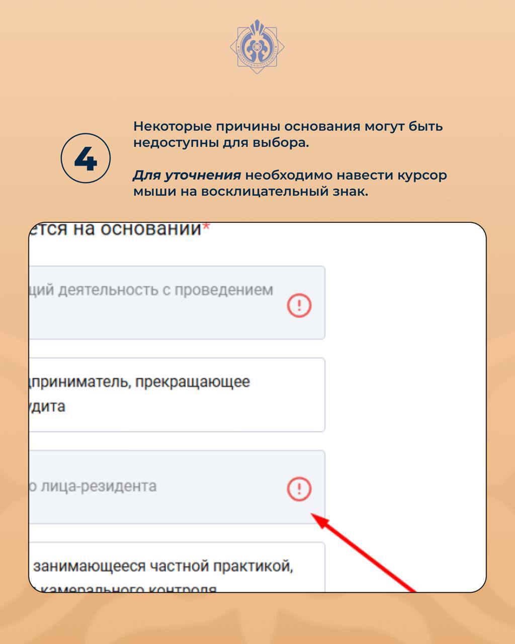 4. Некоторые причины основания могут быть недоступны для выбора. Для уточнения необходимо навести курсор мыши на восклицательный знак.