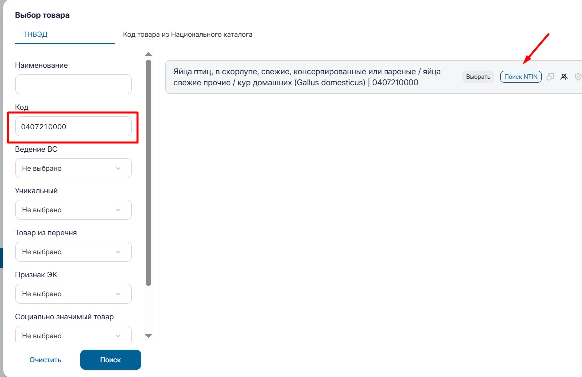 2. Выбор товара по коду ТН ВЭД