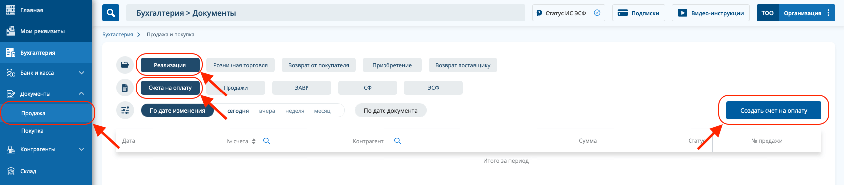 - В главном меню выбрать раздел «Бухгалтерия», «Документы», «Продажа», «Счета на оплату», нажать «Создать счет на оплату»