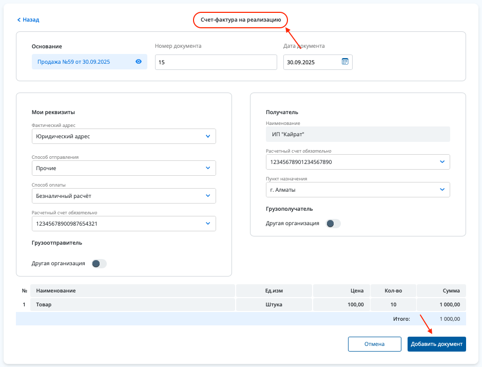- Нажав на «+» под СФ вы автоматически сформируете Счет-фактуру. Сохранить ее в системе можно нажатием на кнопку «Добавить документ».