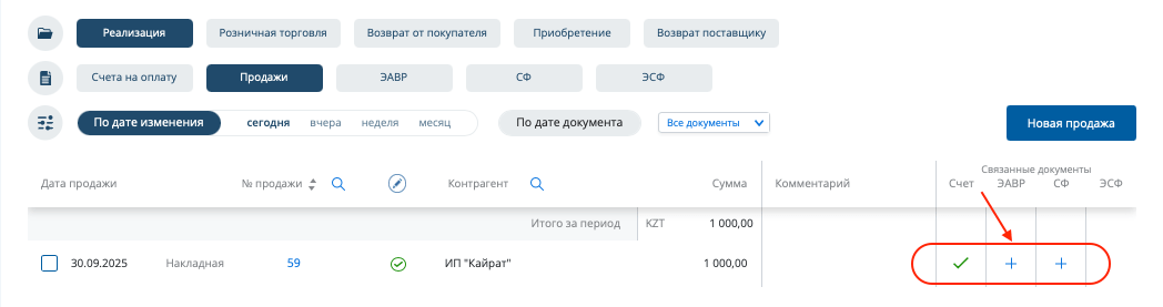 - Если перейти в подраздел «Продажи», то в связанных документах также будет отражено в виде зеленой галочки, что и счет и СФ к данной продаже сформированы. Чтобы создать ЭСФ нужно нажать на «+» под столбцом «ЭСФ».