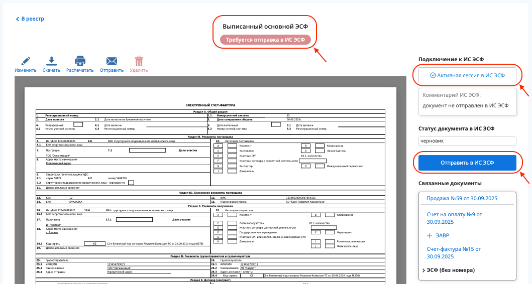 - Откроется черновик «Выписанной основной ЭСФ». Документ можно отправить сразу в ИС ЭСФ с помощью соответствующей кнопки.