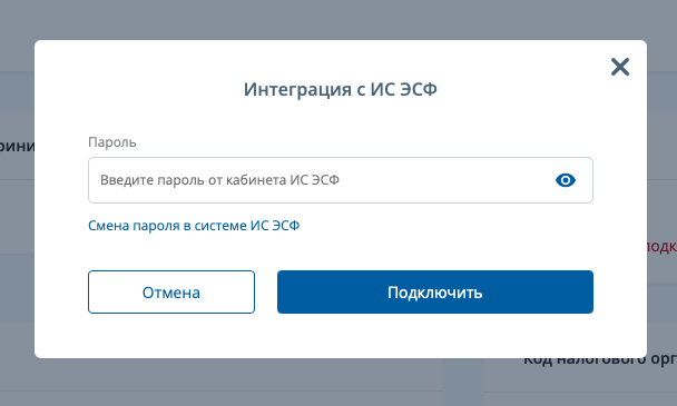 Если вы отправляете ЭСФ из Бизнес-помощника от Mybuh.kz в ИС ЭСФ в первый раз, то при нажатии на кнопку «Начать сессию в ИС ЭСФ» система запросит данные для подключения к ИС ЭСФ. Для этого необходимо ввести пароль от входа на портал ЭСФ.