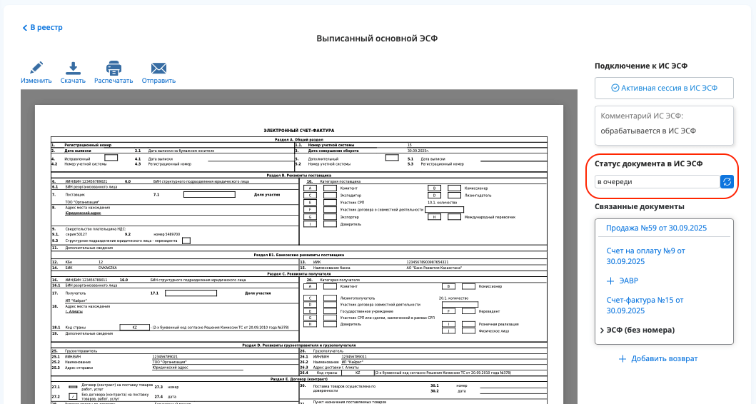 Статус вашего ЭСФ можно увидеть справа от печатной формы (черновик, доставлен и т.д.). Статус можно обновить нажав на синий значок обновления. После того, как ЭСФ будет успешно принят сервером ИС ЭСФ ему будет присвоен уникальный регистрационный номер. В случае ошибки Вы также можете отозвать ЭСФ воспользовавшись соответствующей кнопкой «Отозвать».