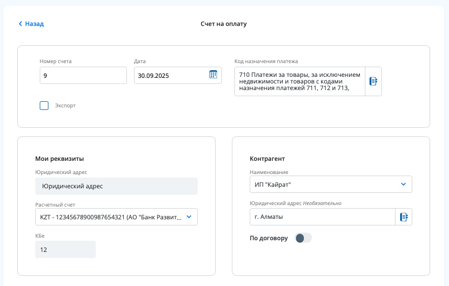 - Создайте «Счет на оплату», заполнив необходимые поля и указав в реестре товары или услуги