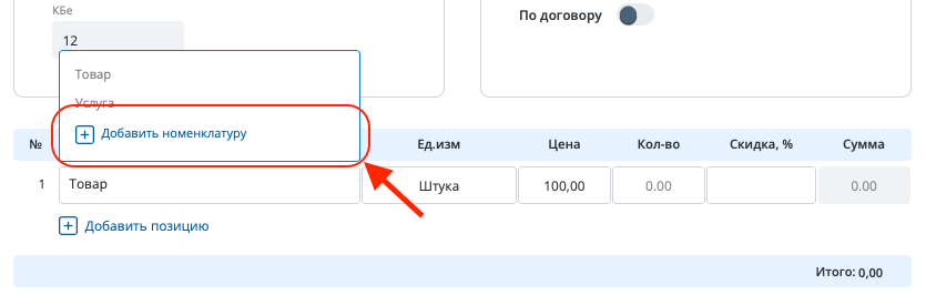 - Если номенклатура товаров и услуг ранее не была введена и список для выбора пуст, можно добавить нужный товар сразу из формы счета на оплату, нажав «Добавить номенклатуру»