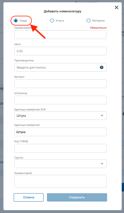 - В форме добавления номенклатуры нужно выбрать, что именно вы реализуете (товар, услугу или материал), а затем заполнить необходимые поля и нажать «Сохранить».