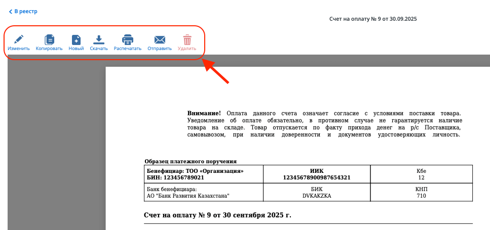 - После сохранения сформируется счет на оплату, который можно изменить, копировать, отправить покупателю и т.д.