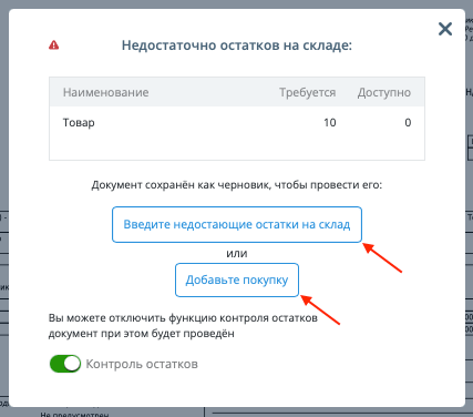 - Обратите внимание, что сервис автоматически проверяет, есть ли в системе данные о нужном количестве товара, планируемого к отгрузке. Если нужный товар на склад в систему не заведен, его нужно ввести (либо отключить функцию контроля остатков). После этого документ будет проведен.