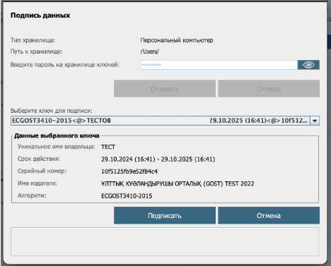 Если вы ранее уже были зарегистрированы на портале ИС ЭСФ, необходимо ввести пароль от кабинета ИС ЭСФ для авторизации и кликнуть на кнопку «Подключить». После ввода пароля необходимо подтвердить запрос с помощью NCALayer. Для этого потребуется выбрать файл ЭЦП и ввести пароль от вашего файла ЭЦП. После выполнения запроса система проверит пароль и создает интеграцию с ИС ЭСФ.