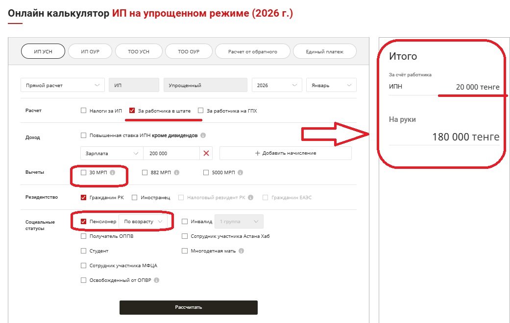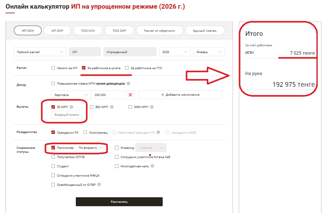 Пример: Работник-пенсионер работает в ИП на упрощенке, оклад составляет 200 000 тг. Также работник написал заявление на предоставление стандартного вычета по ИПН в размере 30 МРП.